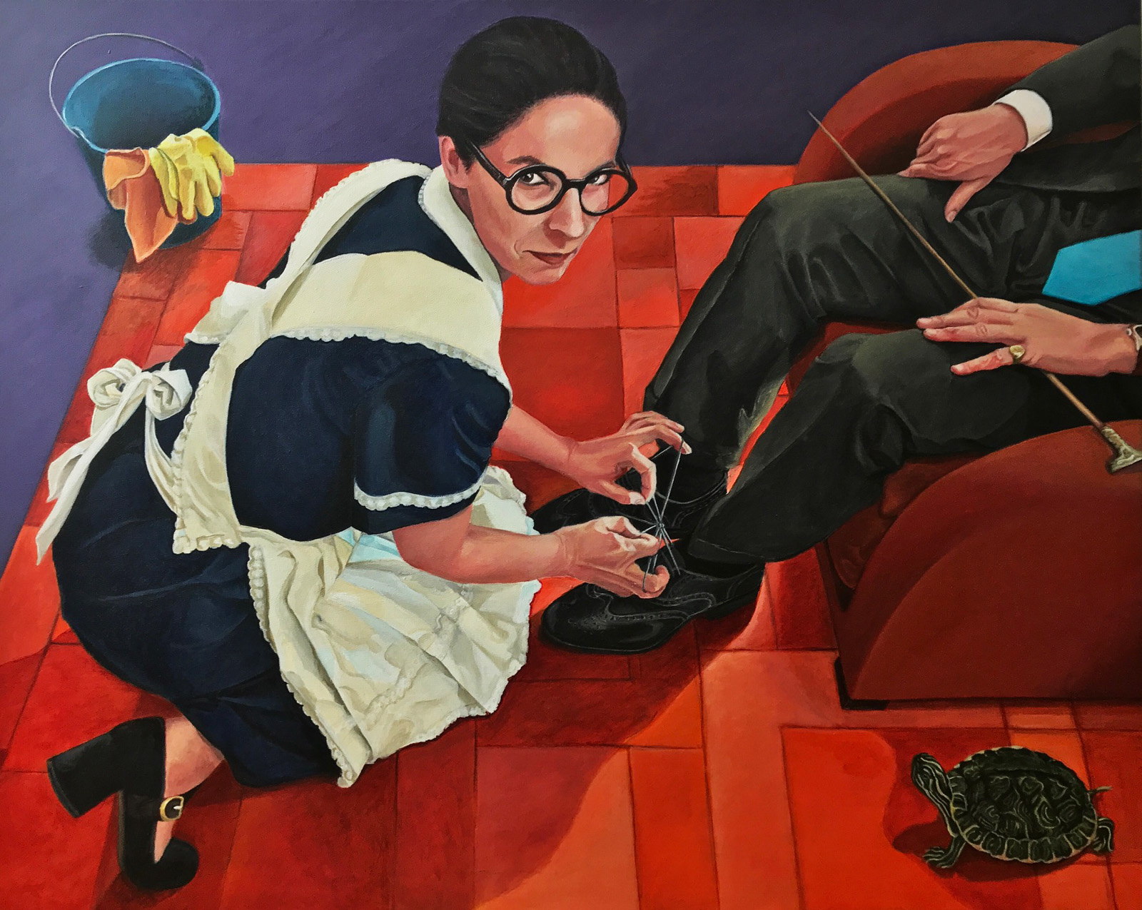 Mirone, eu acho que o observador é o mordomo, já o conhecemos do quadro do crocodilo. Um mordomo precisa de estar hirto, com boa postura, porém, é capaz de partilhar a cumplicidade daquela expressão, mesmo que lá no alto, e até sentir um certo alívio no deboche, agradecido por saber que não será entregue como cúmplice e já com um pingo de saudade da criada. Eu agora queria até um quadro só com a expressão do mordomo.